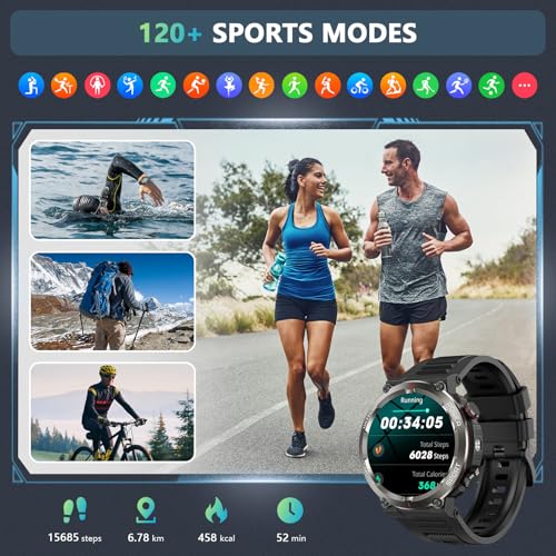 【Military-Standard Quality & 100-Day Battery Life】The frame of this military-grade smartwatch for men is made of a special Zinc alloy shell material that has successfully passed 12 military-grade tests.it passes a series of quality tests, including tumble drying, drop-resistant, salt spray, and scratch resistance. With a battery capacity of up to 960mAh, four times that of conventional smartwatches, it offers 100-day standby and 30-day daily use. It is robust, waterproof, and dustproof, and can handle all extreme environments,making it the perfect companion for outdoor adventures