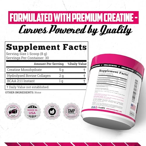 Amplifies Work Output – Creatine Monohydrate for women is scientifically formulated to enhance performance, strength, and endurance during resistance training. With each serving, you’ll power through workouts more effectively, thanks to its ability to increase strength and power output. The formula combines pure Creatine Monohydrate with BCAAs and Collagen to support lean muscle development and glute definition.