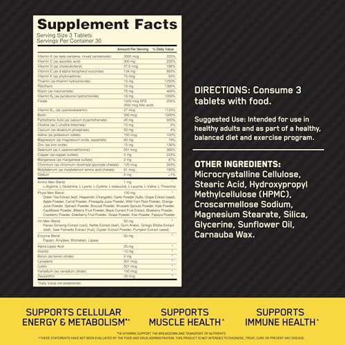 Support your immune system and support your overall health with Optimum Nutrition Opti-Men Daily Multivitamin specially formulated for active men. This men’s daily multivitamin contains 21 essential vitamins and minerals, including Vitamin C, Zinc, Vitamin D, Vitamin E and Vitamin B12, to support your immune system, support gut health, support muscle recovery, support cellular energy and metabolism, and promote overall wellness. Optimum Nutrition Opti-Men daily multivitamin for men includes botanical extracts that can be built on through consumption of a healthy, balanced diet, plus one gram of free form amino acids. Each bottle contains a 30-day supply of 90 Opti-Men multivitamin tablets to help provide immune systems and nutrients for active men. Take 3 tablets with food. There’s more of you in you. Optimum Nutrition has been trusted to provide high quality in post-workout recovery, pre-workout energy, and on-the-go sports nutrition for over 35 years and in 90+ countries.