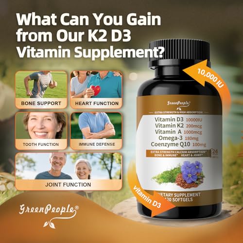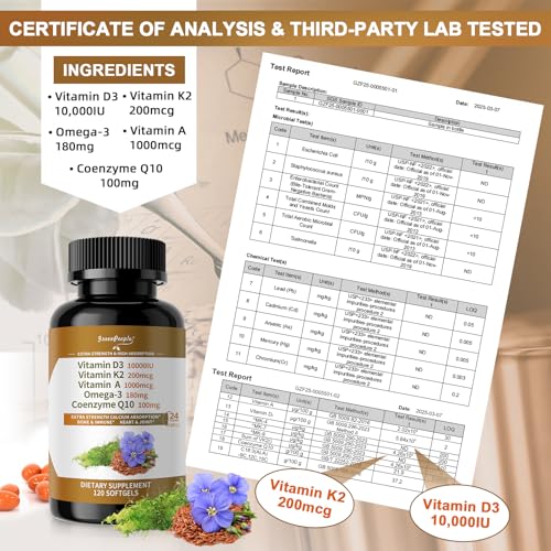 Potent D3 and K2 Supplements Powerhouse: vitamin d3 10000iu (250 mcg), 200 mcg stable MK-7 K2 (in the optimal 5:4 “Golden Ratio” with D3), 1,000 mcg Vitamin A, highly bioavailable Ubiquinol 100 mg CoQ10 (≥2x absorption), and 180 mg Vegan Omega-3. This all-in-one blend nourishes bones, immunity, and heart—holistic wellness in every softgel