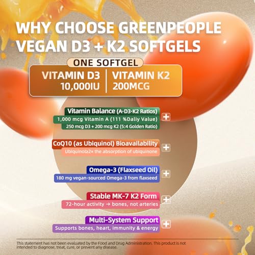 Superior Absorption, Vegan-Friendly: Crafted with algae-sourced D3 and MK-7 K2, the GREENPEOPLE formula ensures high bioavailability. Algae-derived D3 mimics a human-compatible structure for better absorption. Vegan-friendly, vitamin k2 d3 maximizes nutrient uptake, outperforming traditional sources